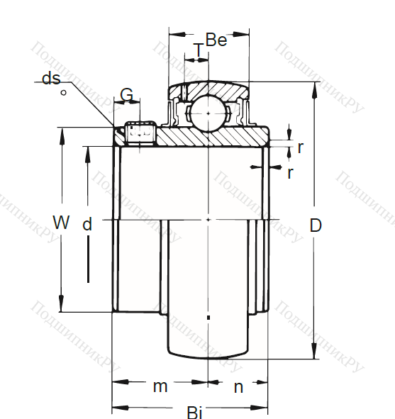 Радиальное шариковое однорядное тело, размещающееся в чугунном корпусе с парой усиливающих колец и внутренней шиной увеличенной ширины. Наружная обойма – сферической либо цилиндрической формы. Для гашения вибраций и шумности может устанавливаться наружное резиновое демпфирующее усиление.